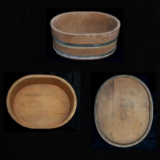2577 昭和レトロ民芸 高島屋 特級 No .1 たまご型湯桶 NEW ! 今はあまり見る事の無い卵型の湯桶、 裏底に、高島屋のロゴマーク及び、( 特級 ) ( No .1) の焼印が施された当時の高級品です。 厚さ 1 cm 程の板 ( 材種は不明 ) を、銅坂と銅線の箍で絞めてあります。 日本製のUSED品 ◆サイズ◆ ( 外寸最大部分 ) 27 × 21 . 5 × h : 11 p 程 ◆状態◆ 外観上、汚れや傷み箇所が随所にあるも、特に酷く傷んだ箇所はありません。 尚、経年の未使用保管により隙箇所があります。 ( 画像参照下さい ) \ 2000 送料-y80 ![]() |
