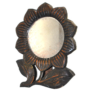 木彫ひまわり型枠 置鏡 1970年代 日本製 ◆サイズ◆ 全体 / w : 15 × h : 19 cm 程 鏡面 / w : 9 cm 程 ◆状態◆ 鏡面劣化の変色があります。 \ 450 送料-241