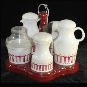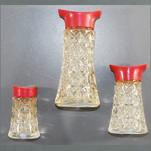 食卓3点セット 蓋は樹脂製 本体は型押し成形硝子製 1960〜1970年代 日本製 ( HOYA ) 未使用品 元箱付 ◆サイズ◆ (最大部分) ソース差し / w : 4 . 8 × h : 17 . 2 p 程 塩・湖沼入れ / w : 4 × h : 10 . 7 p 程 ◆状態◆ まずまず良好です。 \ 1.100 送料-261