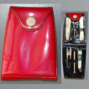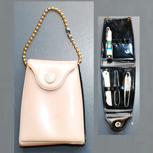 携帯帯用 身だしなみセット ケースビニール製 1960年代 日本製 未使用品 * 内訳 * ハサミ / 爪切り / ナイフ / ピンセット ミニ楊枝/ 耳かき ◆サイズ◆ ( ケースサイズ ) w : 6 . 2 × 8 . 2 cm 程 \ 650 ◆状態◆ 飾鎖が無くなっています。 送料-131