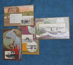 | s0323 戦前朝鮮 「 朝鮮 平壌 大同橋 」 4枚 \4500 m 銀彩を用いた凝ったイラスト ( Y . S サイン ) 付き、 内1枚には設計概要表が掲載されています。 ◆状態◆ 全体にヤケ変色、少し擦れ汚れがあります。 |