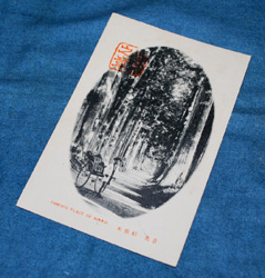 | s0490 「戦前 日光 杉並木の車夫 」 \800 m 遊覧記念スタンプ付、当時の様子が伺えます。 ◆状態◆ ヤケ変色があります。 |