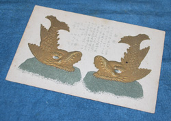 | s0494 「戦前 名古屋城 金シャチ 」 \800 m 型押しに金彩が施された豪華な絵葉書で、 説明文が記載されています。 ◆状態◆ ヤケ変色及びシミがあります。 |